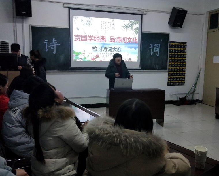 12月26日晚,应用英语与国际教育系2016级语文教育六班开展诗词比赛。比赛有诗词对句题、图片线索题、典故简答题、错字题四种题型,采用抢答和顺序答题两种方式,设置了“挑战九宫格”、“狭路相逢”和“飞花令”三个关卡,主要考察选手对古诗词的背诵情况、字形的掌握以及对诗句中涉猎知识典故的掌握和理解。