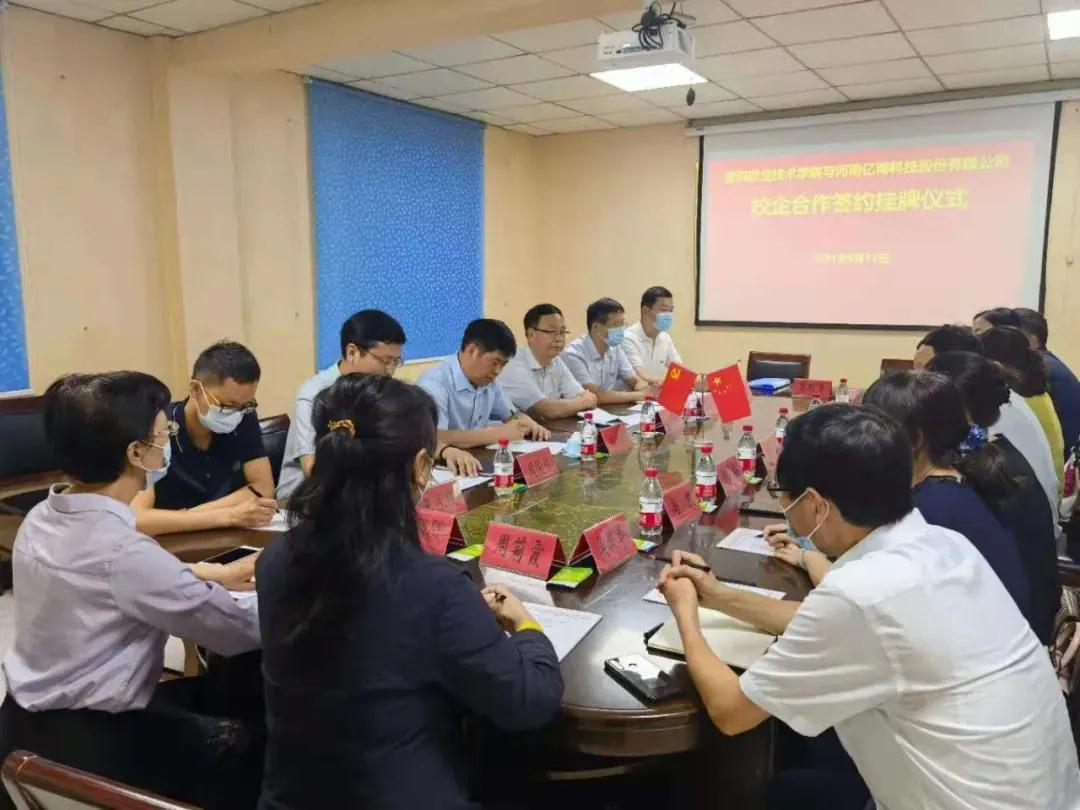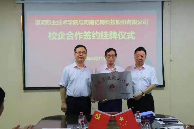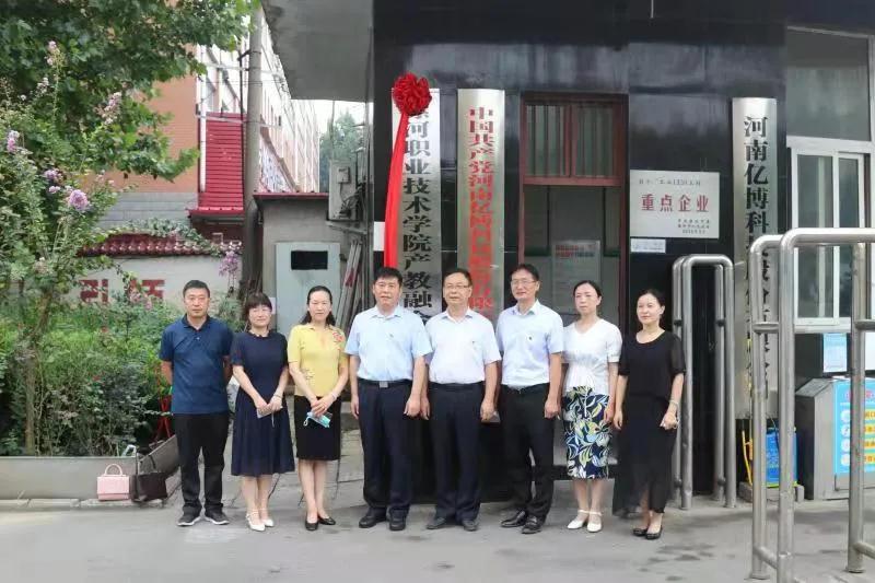 漯河职院党委委员、副校长朱晓红,河南亿博科技股份有限公司董事长李彦红共同为“漯河职业技术学院产教融合实训基地”揭牌并合影留念。