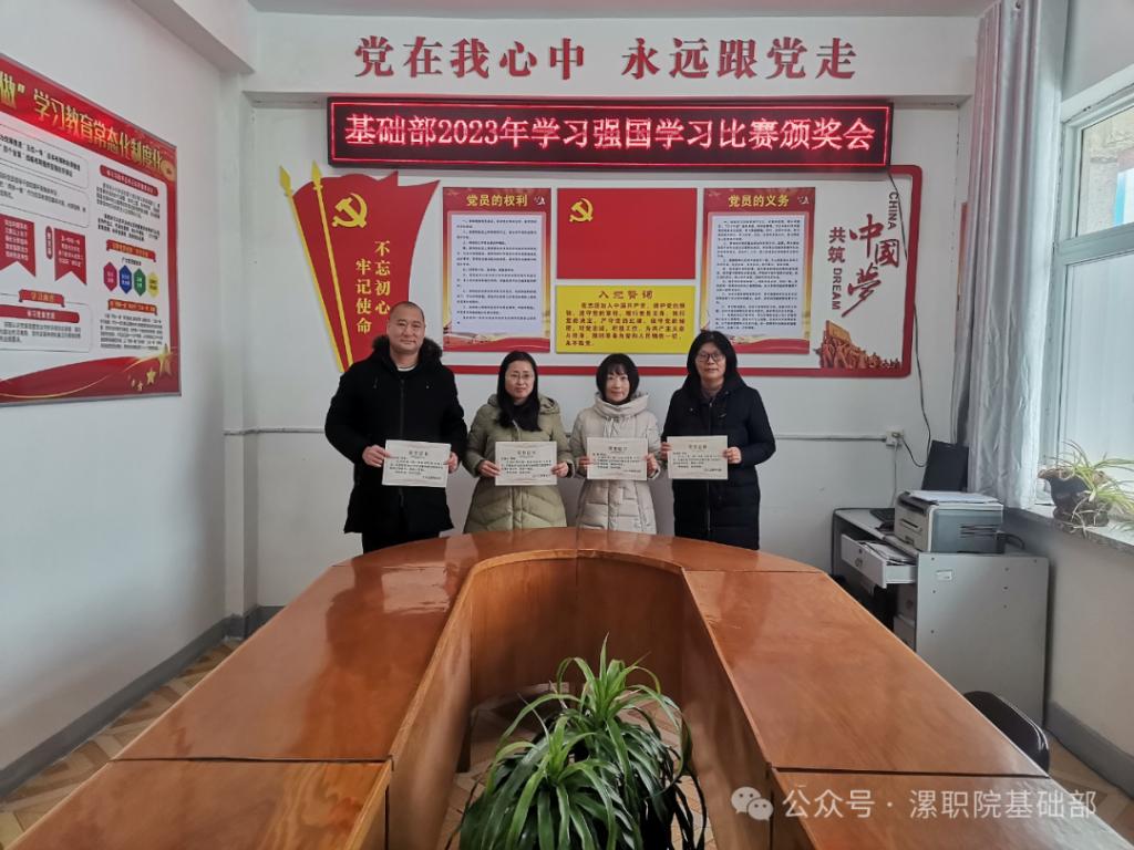 1月18日,漯河职业技术学院基础部召开2023年学习强国学习比赛颁奖会,对2023年度学习强国学习比赛中表现突出的先进个人进行表彰。基础部党支部书记兼主任朱献周为新增分排名一等奖获得者王俊玲、李晓斌和总积分排名一等奖获得者陈瑛、赵树峰颁发证书。全体党员教师参加会议。