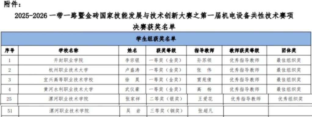 近日,2025-2026一带一路暨金砖国家技能发展与技术创新大赛——第一届机电设备共性技术决赛在开封职业学院隆重举行。来自全国多所院校80余支参赛队伍齐聚一堂,围绕机电设备共性技术展开激烈角逐。我校智能制造学院智能控制技术专业学生张家祥、吴岩参赛并荣获佳绩。