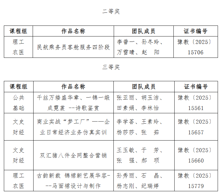 近日,河南省教育厅下发《河南省教育厅办公室关于公布2025年河南省高等职业教育教学能力大赛获奖名单的通知》(教办职成〔2025〕202号),我校选派的5支参赛团队全部获奖,其中二等奖1项、三等奖4项,实现了学校在该项赛事的新突破。