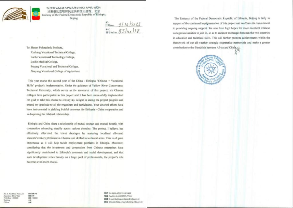 近日,漯河职业技术学院收到了来自埃塞俄比亚联邦民主共和国驻华大使馆发来的感谢信,使馆对我校在“中文+职业技能”项目中发挥的重要作用以及取得的成果给予高度评价,这是我校职业教育国际化工作获得国际认可的重要体现,也是我校落实“一带一路”倡议下教育互联互通的生动实践。