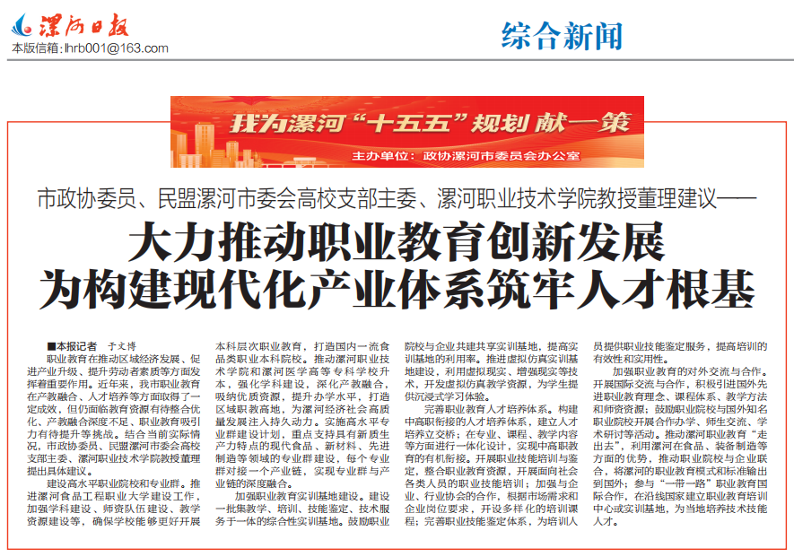 近日,我校董理教授撰写的关于职业教育创新发展的政策建议文章,在《漯河日报》综合新闻版显著位置全文刊登,引发社会各界广泛关注与好评。董理作为市政协委员、民盟漯河市委会高校支部主委及我校教授,始终密切关注区域职业教育发展。该文以“大力推动职业教育创新发展 为构建现代化产业体系筑牢人才根基”为题,系统阐述了推动我市职业教育高质量发展的具体路径与前瞻性建议。文章围绕建设高水平职业院校和专业群、加强实训...