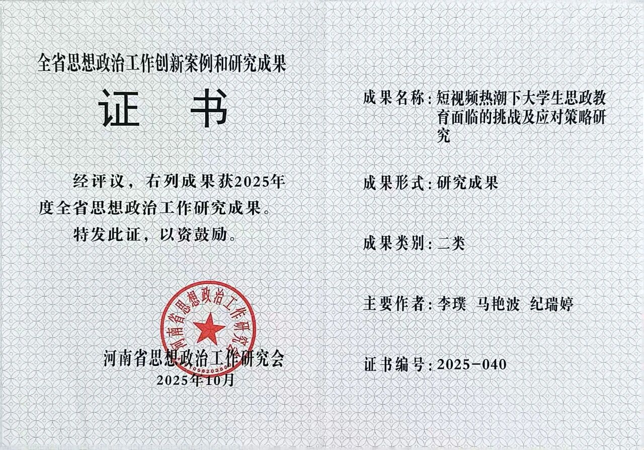 近日,2025年度河南省思想政治工作研究成果评选结果公布。我校服装设计学院李璞、马艳波、纪瑞婷三位教师共同完成的研究成果《短视频热潮下大学生思政教育面临的挑战及应对策略研究》,荣获二类研究成果。该成果立足新媒体时代背景,聚焦当前大学生思想政治教育面临的前沿问题,以课程建设为主渠道,系统探索思政课程、课程思政及短视频相关课程的融合路径,并提出一系列具有操作性的教学建议。研究同时涵盖教师能力提升、平...