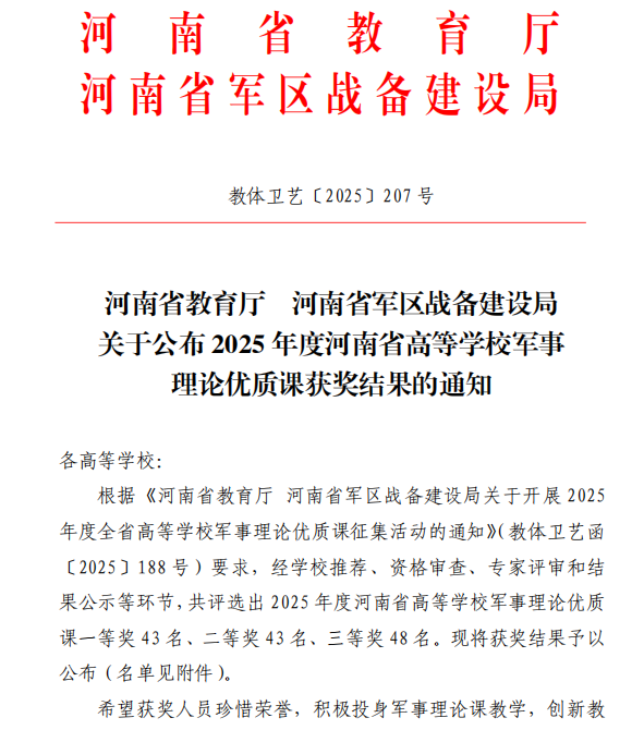 近日,河南省教育厅、河南省军区战备建设局发布《关于公布 2025年度河南省高等学校军事理论优质课获奖结果的通知》。我校教师杨文杰讲授的《信息化战争》课程荣获省级三等奖。学校党委始终高度重视国防教育工作,为本次参赛提供了坚实的组织保障和资源支持。我校教师凭借扎实的教学功底和不懈的拼搏精神,连续两年在省级军事理论课评选中斩获佳绩,展现了良好的专业素养与持续进取的风貌。近年来,学校坚持以习近平新时代中国...
