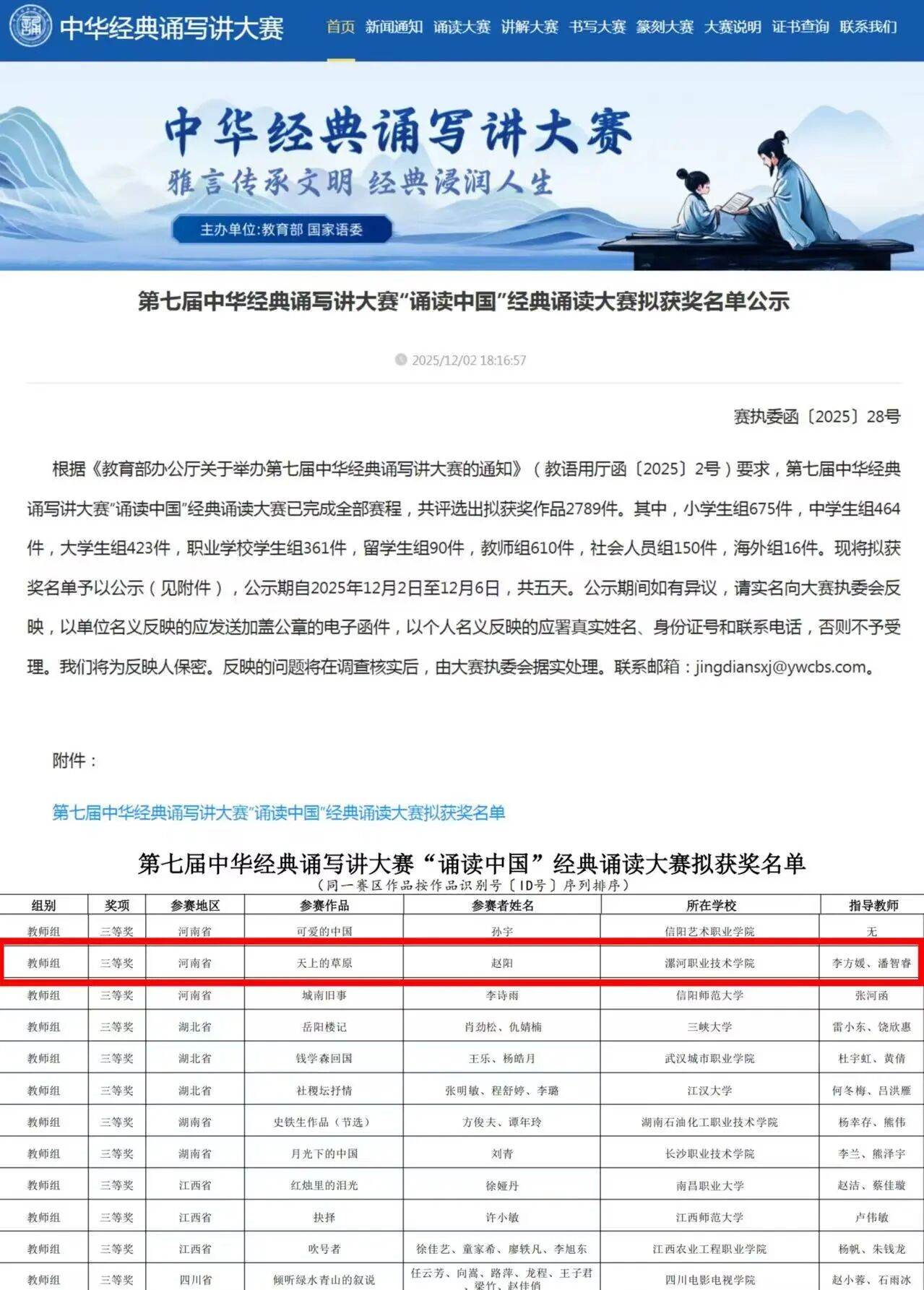 近日,第七届中华经典诵写讲大赛“诵读中国”经典诵读大赛获奖名单正式公布。我校文化旅游学院赵阳老师凭借深厚的朗诵功底与对经典文化的深刻理解,历经层层选拔,最终在国家级舞台上脱颖而出,荣获教师组三等奖。本届大赛由教育部、国家语委主办,西南大学、浙江传媒学院承办,赛事覆盖广泛、流程严谨,具有较高的权威性与社会影响力。自2024年9月启动以来,经过省赛、全国初赛、复赛及总决赛等多轮激烈角逐,赵阳老师始终全心...