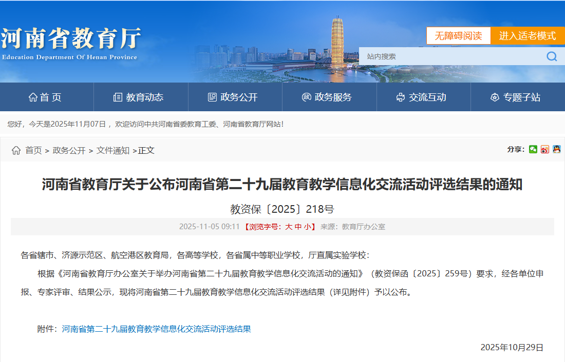 近日,河南省教育厅公布了第二十九届教育教学信息化交流活动评选结果,我校在本次活动中表现优异,共斩获12个奖项,其中一等奖3项,充分展现了学校在信息化教学建设方面的扎实积累与创新能力。本届教育教学信息化交流活动由河南省教育厅主办,旨在深入贯彻落实《教育信息化2.0行动计划》精神,推动信息技术与教育教学深度融合,提升教师信息化教学水平和教育管理效能。我校高度重视此次参赛工作,在校内积极组织作品选拔与推荐...
