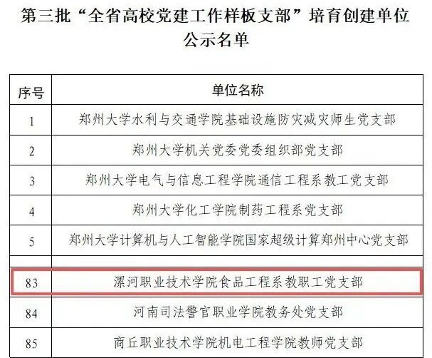 近日,中共河南省委教育工作委员会公示第三批“全省高校党建工作样板支部”培育创建单位名单,我校食品工程系教职工党支部成功入选。这是我校党建工作取得的又一重要成果,充分体现了学校基层党组织建设的扎实成效。食品工程系党支部始终坚持以习近平新时代中国特色社会主义思想为指导,紧密围绕立德树人根本任务,深入落实学校“1+3+N”思政育人工作格局,紧密结合漯河作为“中国食品名城”的独特区域产业优势,积极探索与实践...